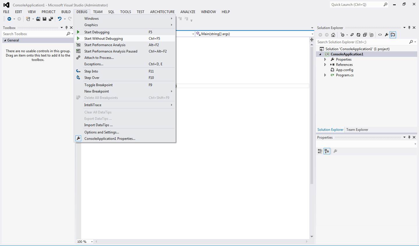 - После чего переходим в меню «Debug» -> «Start Without Debugging»