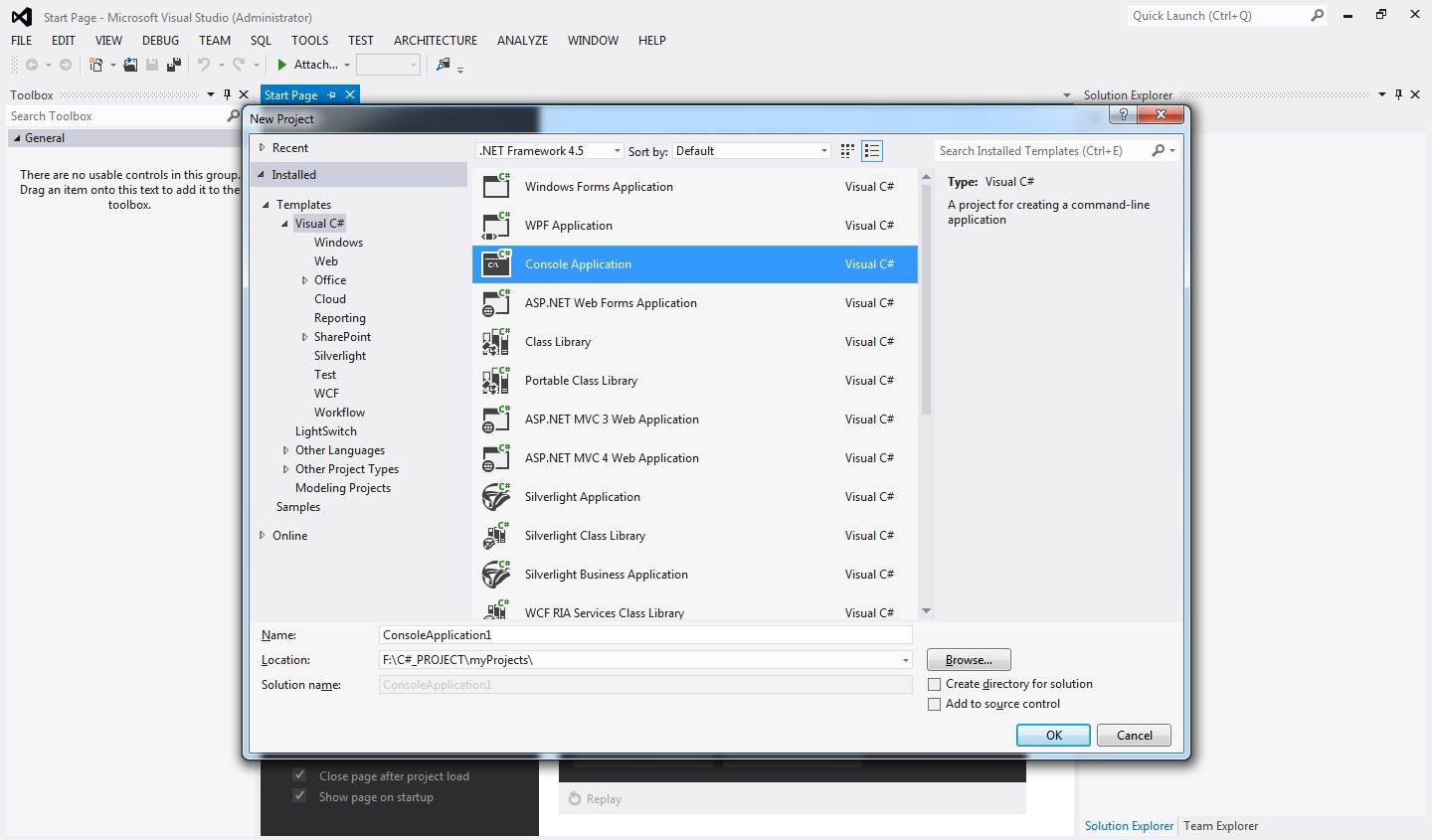 - Переходим в меню «File->New->Project и в открывшемся окне выбираем Console Application. Название проекта можете оставить по умолчанию. Нажимаем ОК и Visual Studio создает для нас среду разработки.